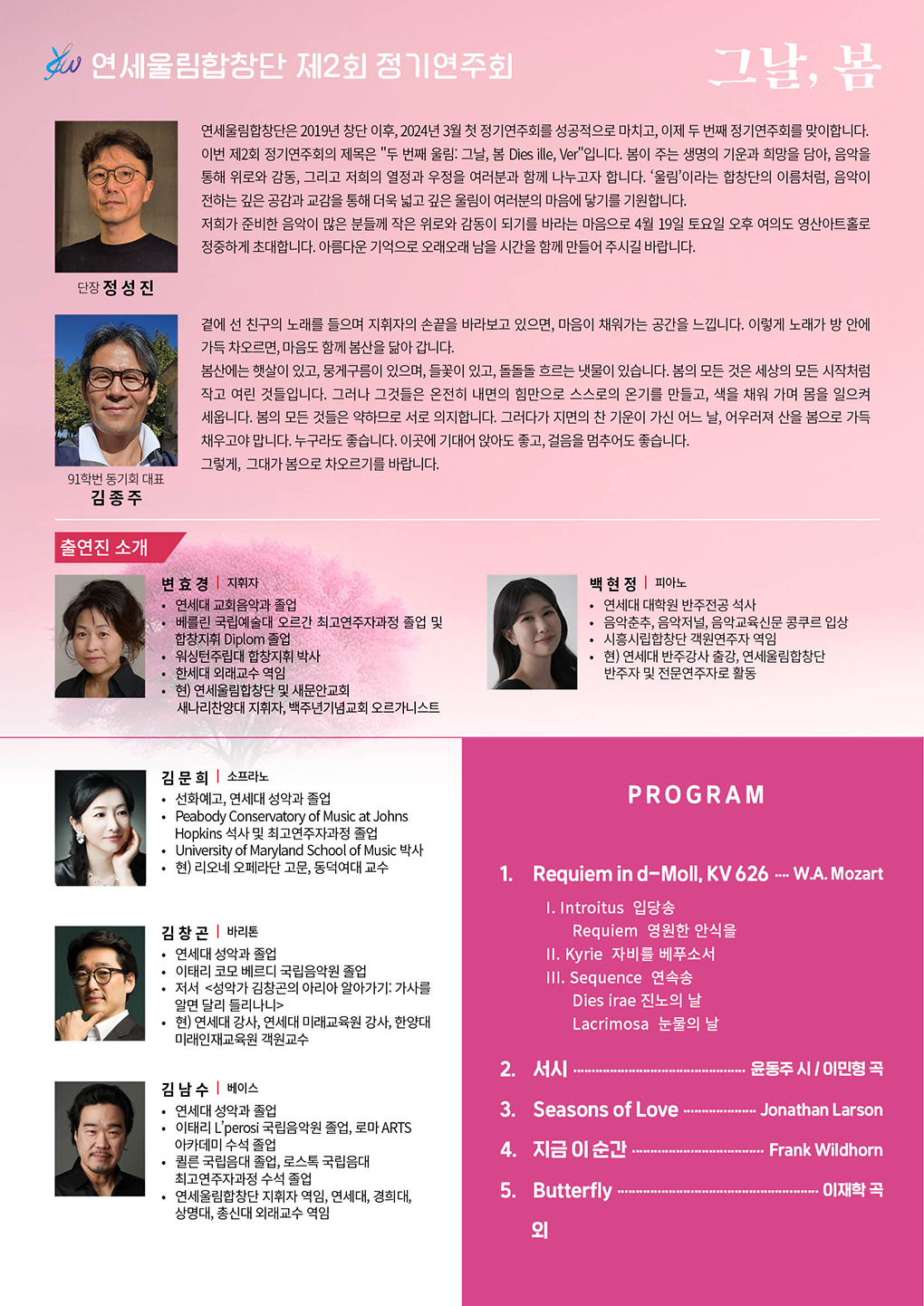 이번 제2회 정기연주회의 제목은 "두 번째 울림: 그날, 봄 Dies ille, Ver"입니다. 봄이 주는 생명의 기운과 희망을 담아, 음악을 통해 위로와 감동, 그리고 저희의 열정과 우정을 여러분과 함께 나누고자 합니다. ‘울림’이라는 합창단의 이름처럼, 음악이 전하는 깊은 공감과 교감을 통해 더욱 넓고 깊은 울림이 여러분의 마음에 닿기를 기원합니다.
