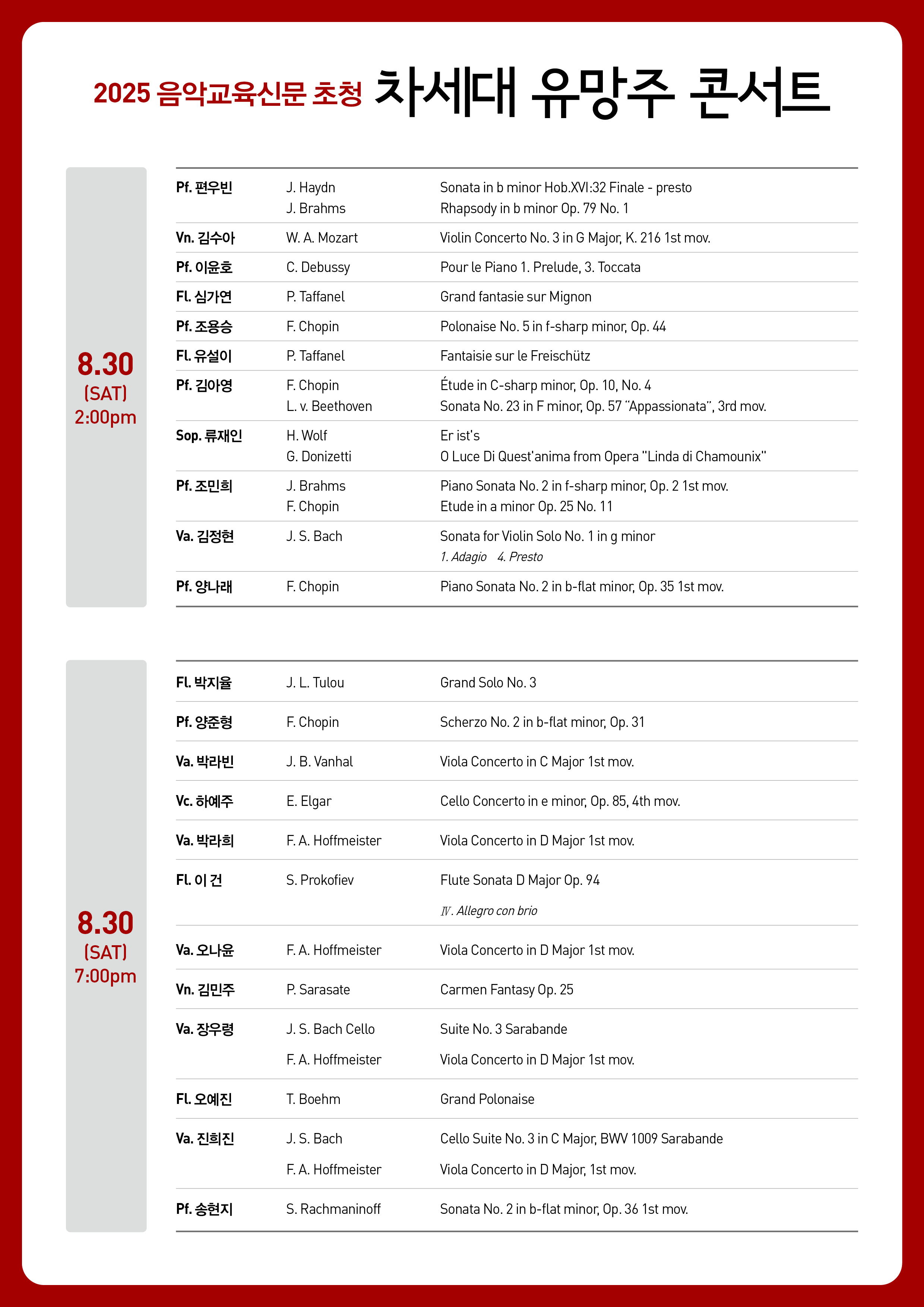 일 시 : 2025년 8월 30일 (토) 오후 2시, 7시