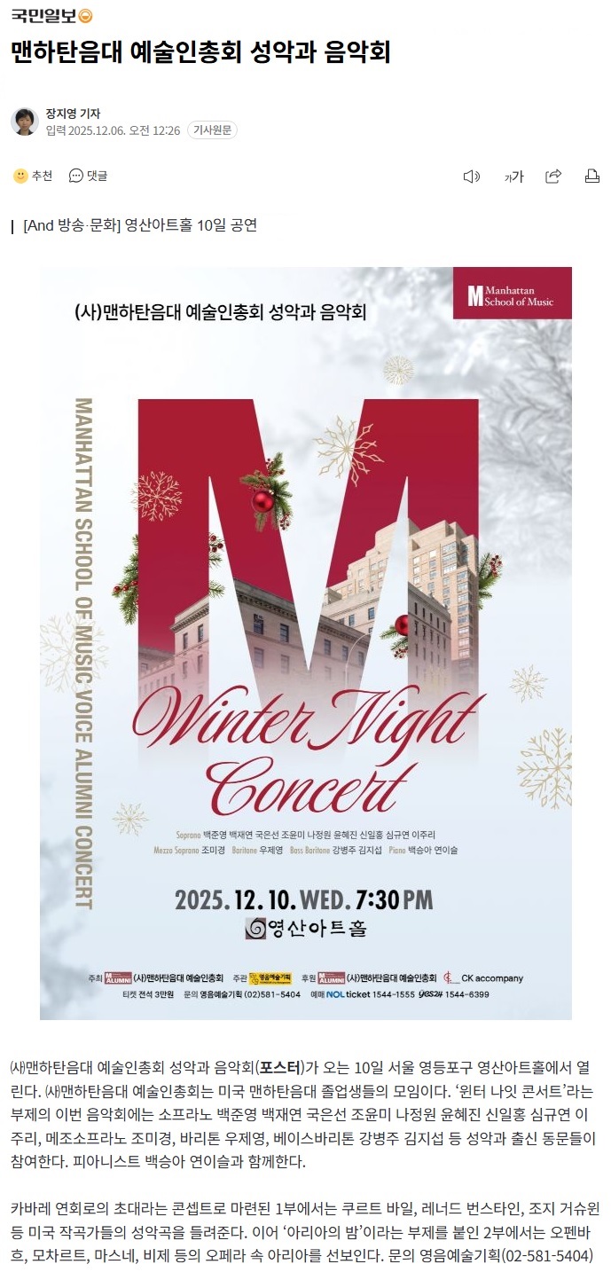 <국민일보> 2025년 12월 10일, 13일 - 맨하탄음대 예술인총회 성악과 음악회·오소라 피아노 독주회
