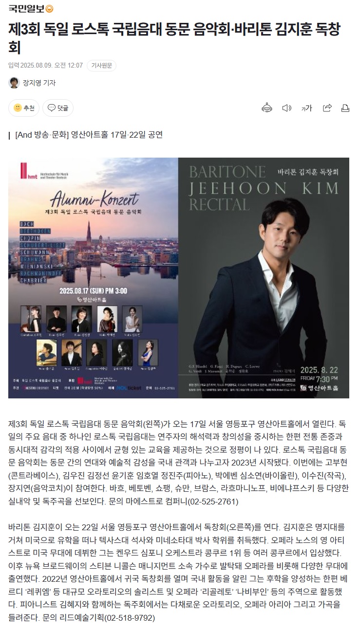 <국민일보> 2025년 8월 17일, 22일 - 제3회 독일 로스톡 국립음대 동문 음악회·바리톤 김지훈 독창회
