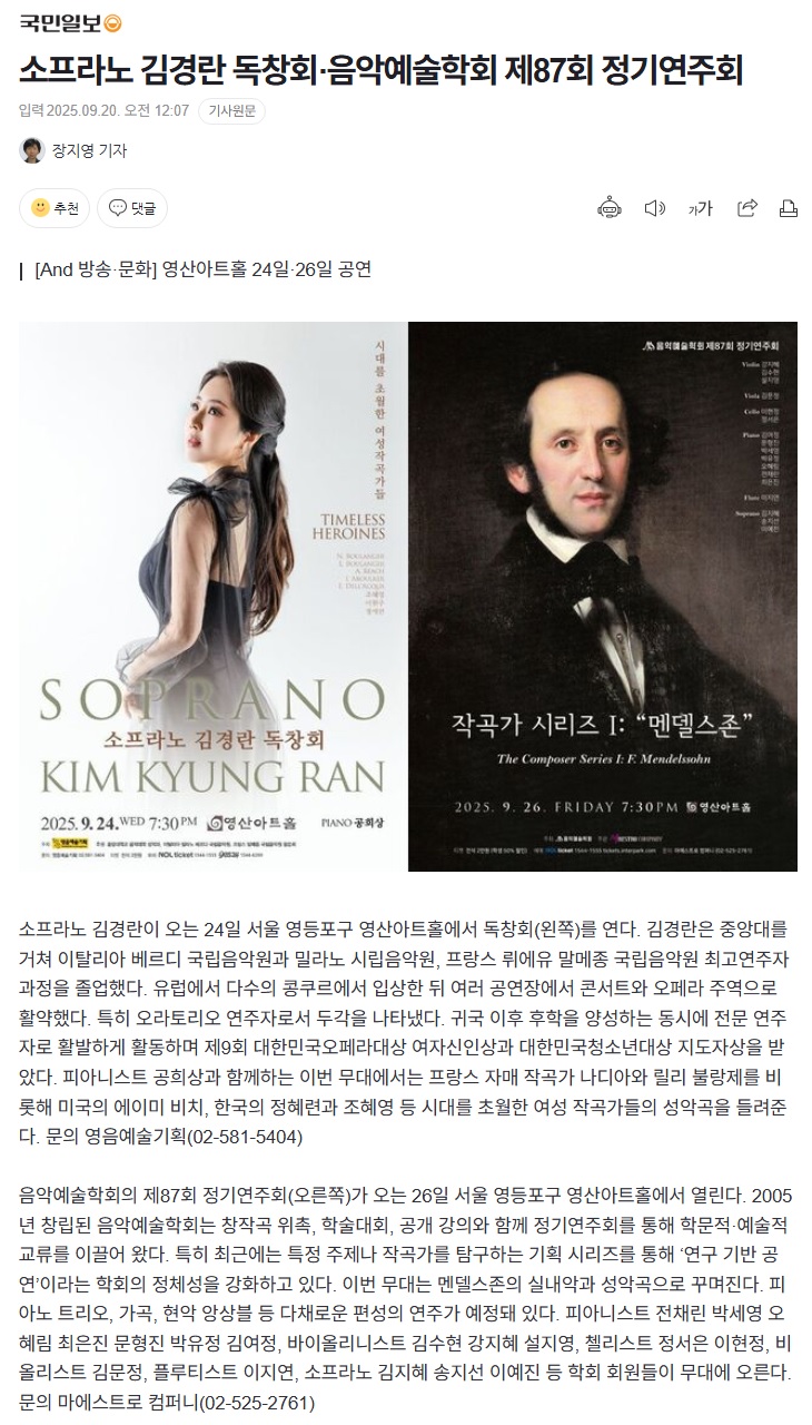 <국민일보> 2025년 9월 24일, 26일 - 소프라노 김경란 독창회·음악예술학회 제87회 정기연주회