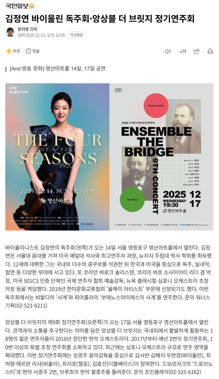 <국민일보> 2025년 12월 14일, 17일 - 김정연 바이올린 독주회·앙상블 더 브릿지 정기연주회