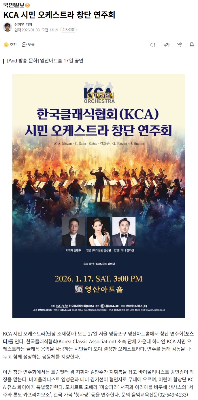 <국민일보> 2026년 1월 17일, 20일 - 한국클래식협회(KCA) 시민 오케스트라 창단 연주회·메조소프라노 황현희 귀국 독창회